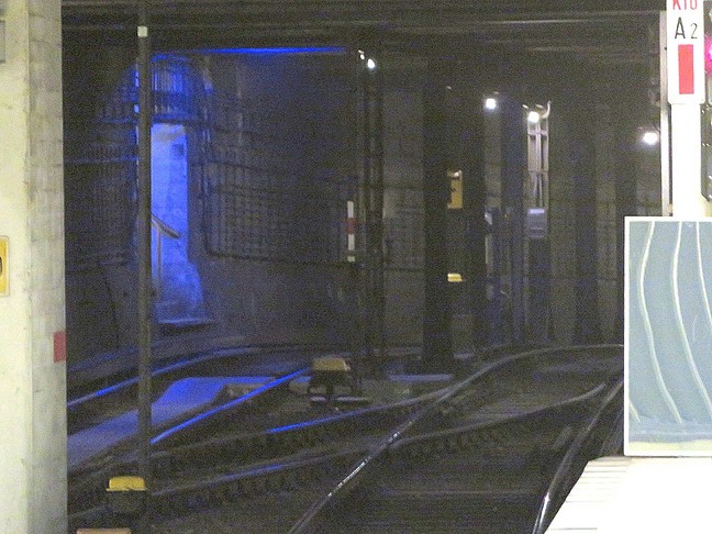 ![]() Fahrtrichtung Kurfürstenstraße und in die Abstellanlage unter der Genthiner Straße (die bis fast an die Lützowstraße geht), dieses Tunnelstück war für die geplante Linie zum Tiergarten Mitte der zwanziger Jahre gebaut worden und wurde 1970/71 zu einer Abstellanlage verlängert ![]() |