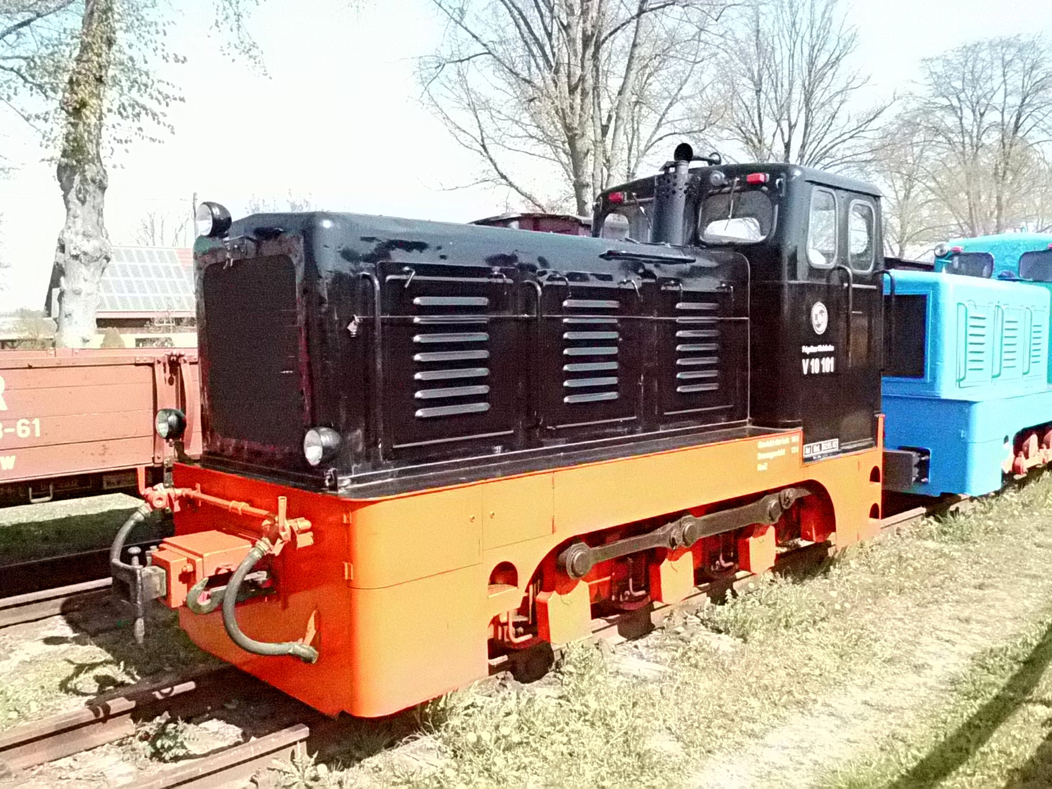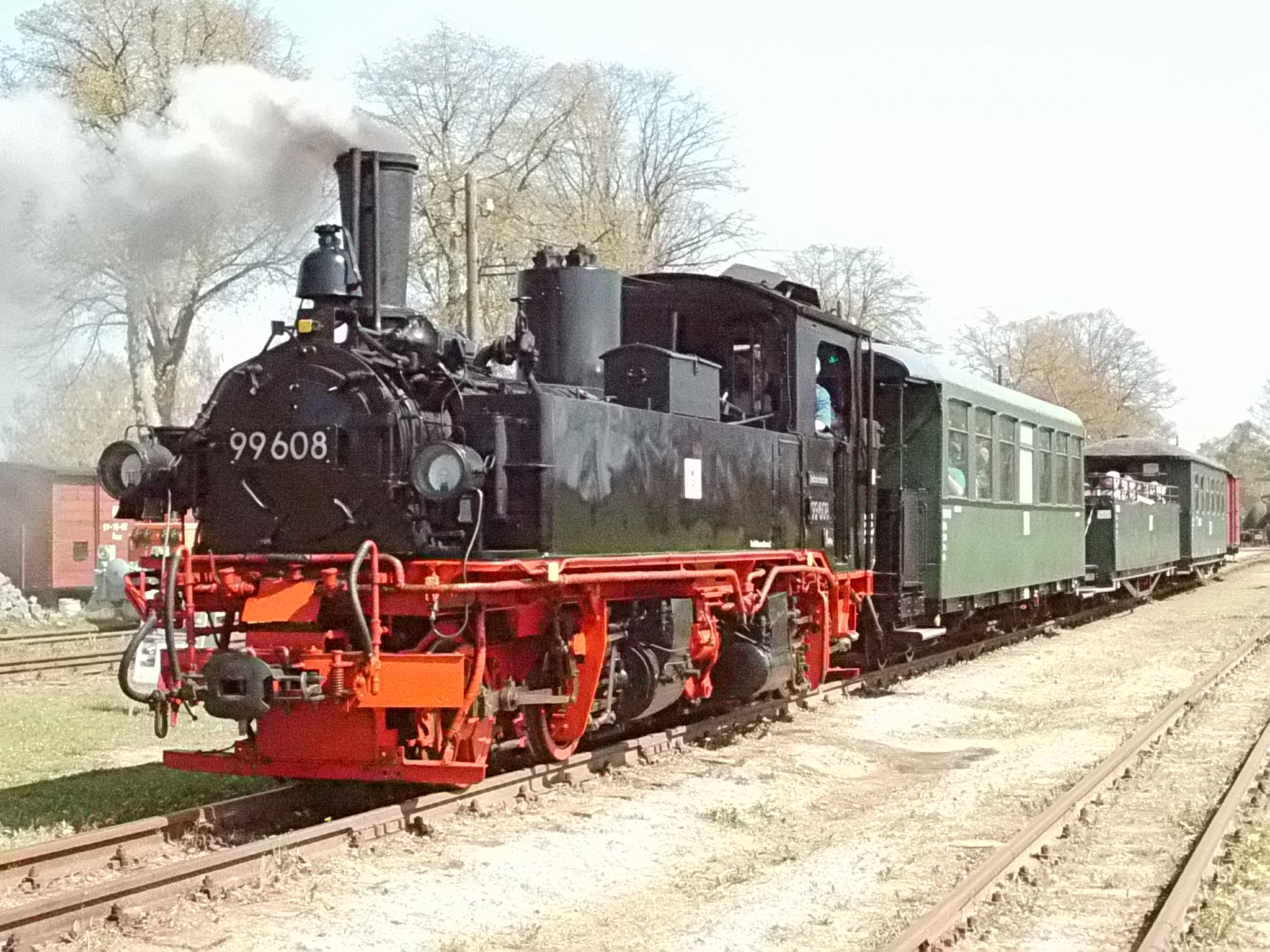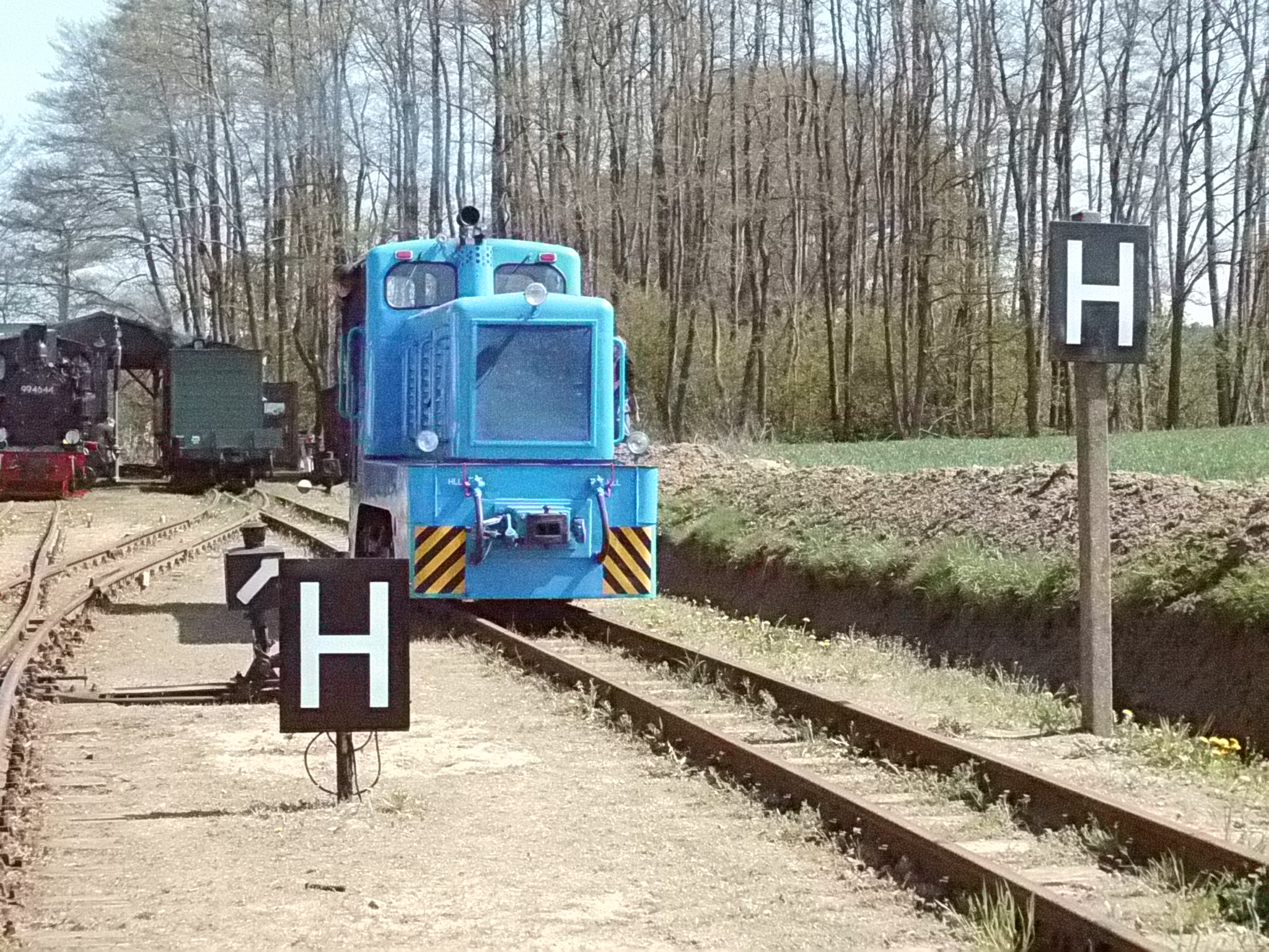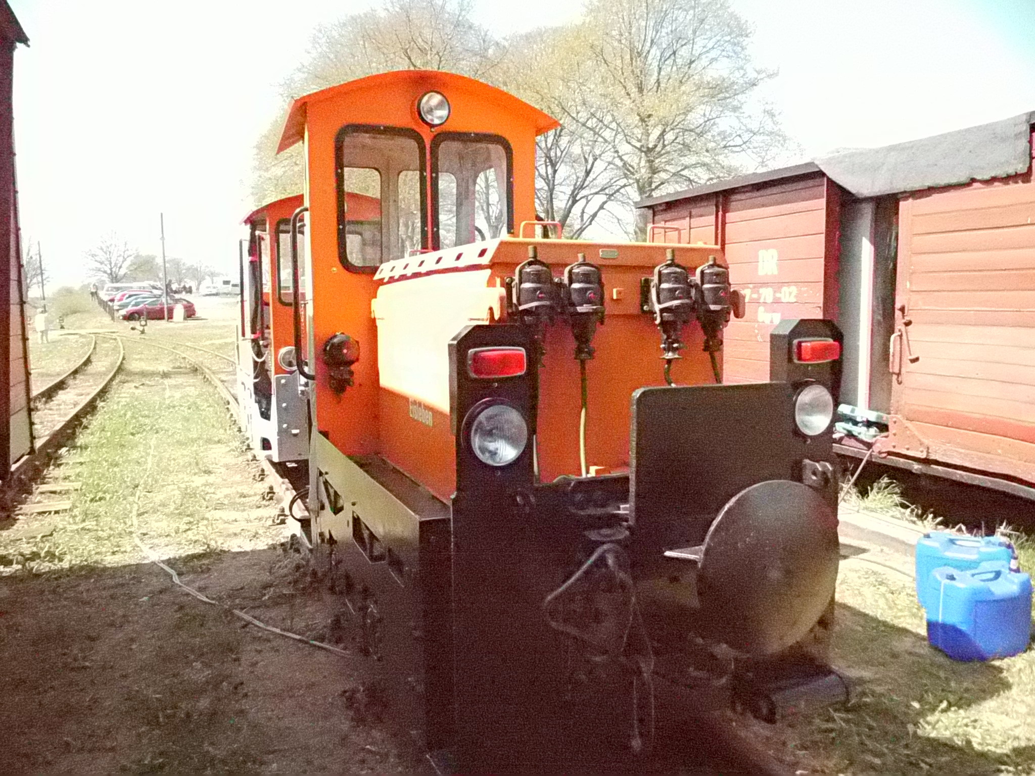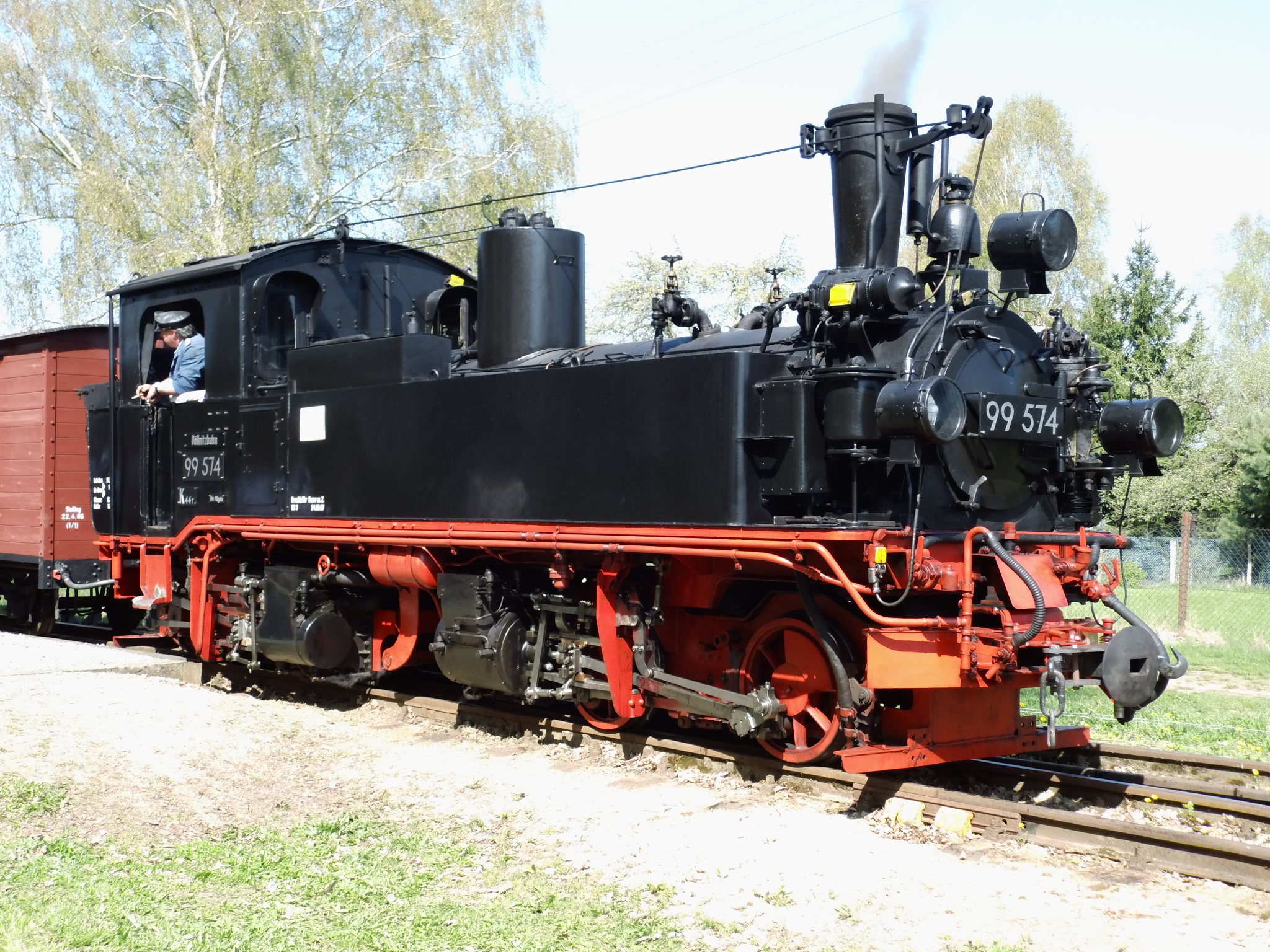 99 574 vom "Wilden Robert" zu Besuch aus dem sächsischen Mügeln, nicht die erste große Reise dieser Lok, schon vom 22.11.55 bis 23.1.56 war sie bei der Kleinbahn des Landkreises Jerichow I zu Gast. Hersteller: Hartmann - Baujahr: 1912 - Fabriknummer: 3556 - Sächsische Betriebsnummer: 164 - Rekonstruktion/Neubau: 1964 RAW Görlitz - Reichsbahn-Nummer bis 1970: 99 574 - Besonderheit: Druckluftbremse Im Bahnhof Lindenberg 99 4511 - Bauart: Cn2t - Die letzte "heimliche" Neubaudampflok für die Deutsche Reichsbahn (DDR) wurde 1966 auf Rügen in Betrieb genommen. Am 4. Januar 1967 wurde die Lokomotive dem Bw Wittenberge zugeteilt. Von diesem Zeitpunkt an gehörte die Lokomotive zur Prignitzer Schmalspurbahn. Am 6. März 1973 wurde die Lok ausgemustert. 1998 kaufte die IG Preßnitztalbahn e.V. die 99 4511 und baute die Lok neu auf. Sie ging am 18. Mai 2002 wieder in Betrieb. V 10 101 V 10 103 In Mesendorf 99 608 (Gattung IV K) der Sächsischen Dampfeisenbahngesellschaft (SDG) in Mesendorf ![]() 99 4644 (Vor-)Wärmeschutzwagen 97-52-73 Baureihe EL 9 aus Hennigsdorf bei Berlin Diese Kleinloks stammen aus dem Lokomotivbau Elektrotechnische Werke Hans Beimler Hennigsdorf und passen in der Größe eher zu einer Gruben- oder Feldbahn als zu einer schmalspurigen Kleinbahn. Ehemaliges Einsatzgebiet rund um Mansfeld (heute Mansfelder Bergwerksbahn). 99 608 mit ihrem Zug nach Lindenberg bereit zur Abfahrt in Mesendorf. V 10 102 99 574 ist aus LIndenberg kommend in Mesendorf eingetroffen. Wagen 97-55-16 Wagen 97-52-71 Die Lok hat umgesetzt und wird den Zug gleich an den Bahnsteig in Lindenberg zurück drücken. |